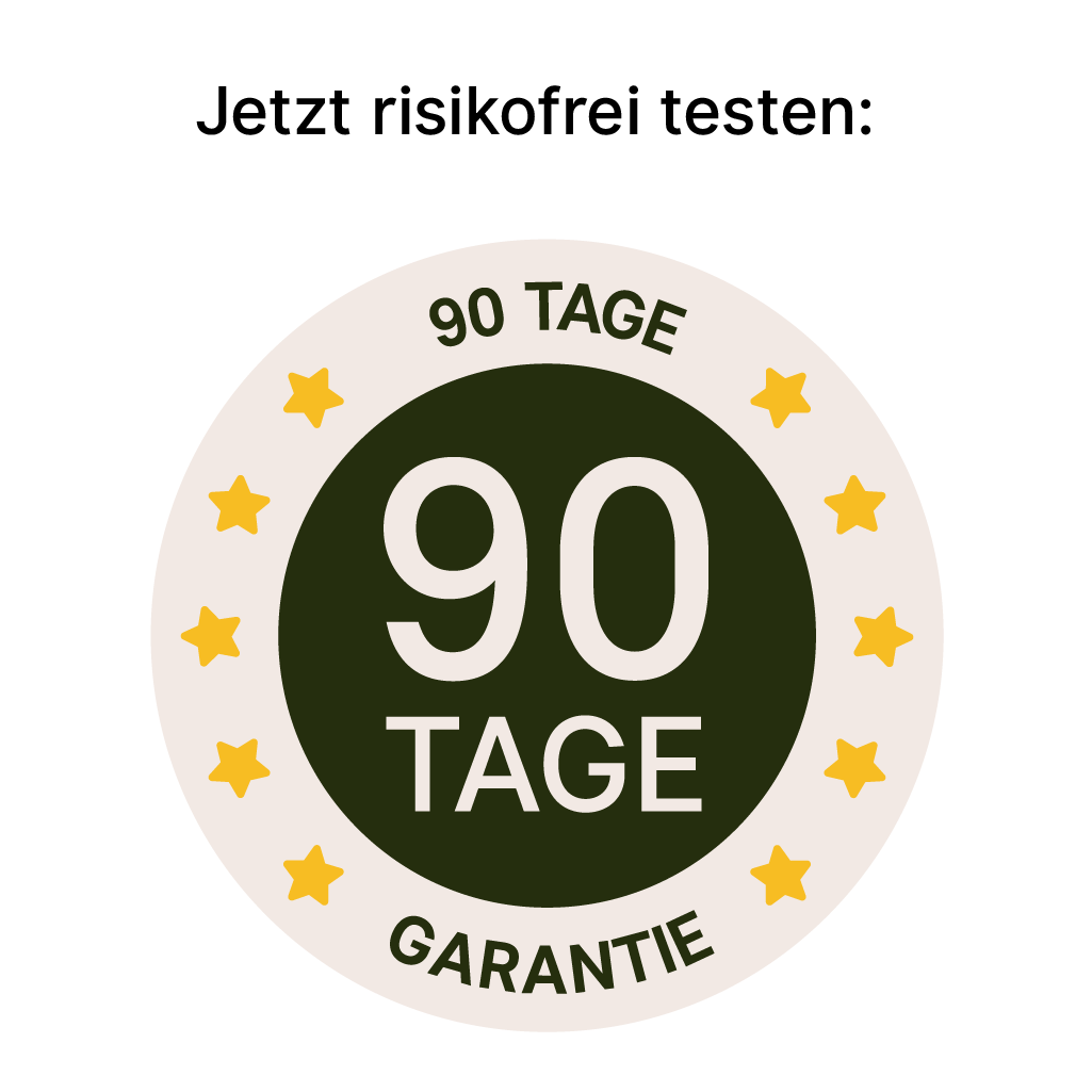90 Tage Zufriedenheitsgarantie: Du kannst das Produkt in Ruhe ausprobieren. Solltest du nicht zufrieden sein, erhältst du dein Geld zurück – einfach und unkompliziert.